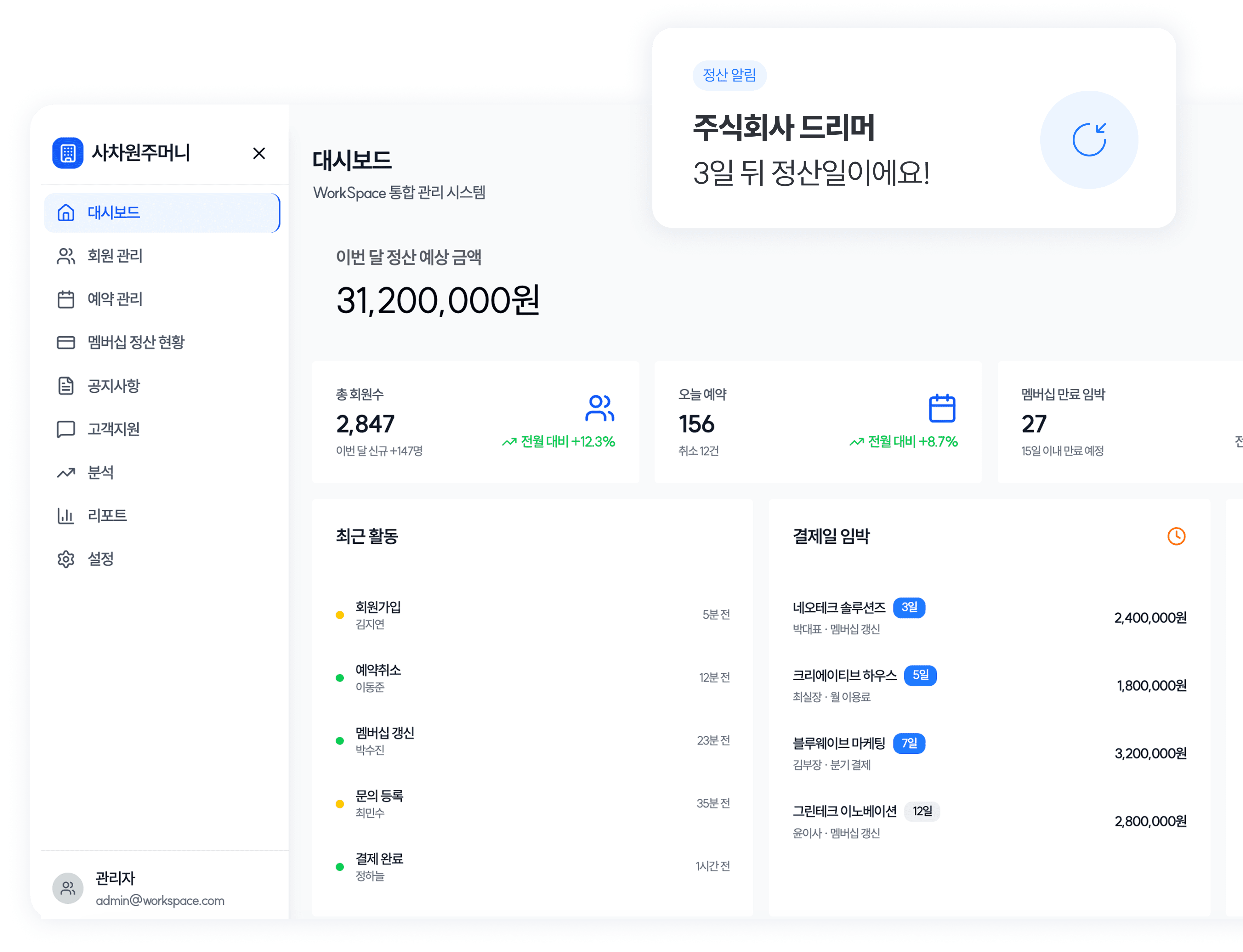 총 회원 수 · 오늘 예약 · 멤버십 만료 · 결제일 임박 현황 등 주요 지표를 실시간 분석